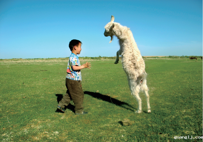 张嘎巴特尔,一位普通的蒙古族牧民,平时对摄影非常着迷,是个准发烧友级摄影爱好者,这次介绍他的两幅摄影作品。《挤奶》是他在乌审旗嘎鲁图镇牧场拍到的。照片上的蒙古族妇女,一手提着挤奶桶,一手牵着顽皮的孩子,蒙古族妇女吃苦耐劳、辛苦劳作的形象跃然而上。画面中妇女黝黑的侧脸映衬出牧民特有的坚毅,与回头张望的孩童充满好奇的脸形成对比,为整个画面增加了情趣。《玩伴》是他的另一幅摄影作品,蓝天碧草间,一个蒙古族小童和一只山羊在玩耍。山羊高高跃起,梗着脖子准备去顶小男孩,小男孩也张开手指,做出准备迎击的样子,很是滑稽,人与动物、自然的和谐之美跃然而上。