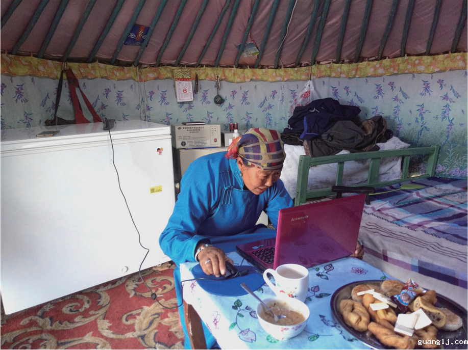 《牧民淘宝》是草原医生斯琴巴图用手机拍摄的摄影作品,他拍摄于锡林郭勒盟正蓝旗桑根达来镇的阿拉台嘎查夏营盘一户普通的牧民家。随着人们物质生活水平的提高,科学知识的普及,牧民也开始从网上购物啦!照片里,蒙古包中的老额吉(妈妈)正聚精会神地在电脑前上网购买商品,照片反映了科技不仅为草原牧民的生活带来了便捷,更带来了现代生活理念。如今,网络已成为广大牧民认识世界的窗口。