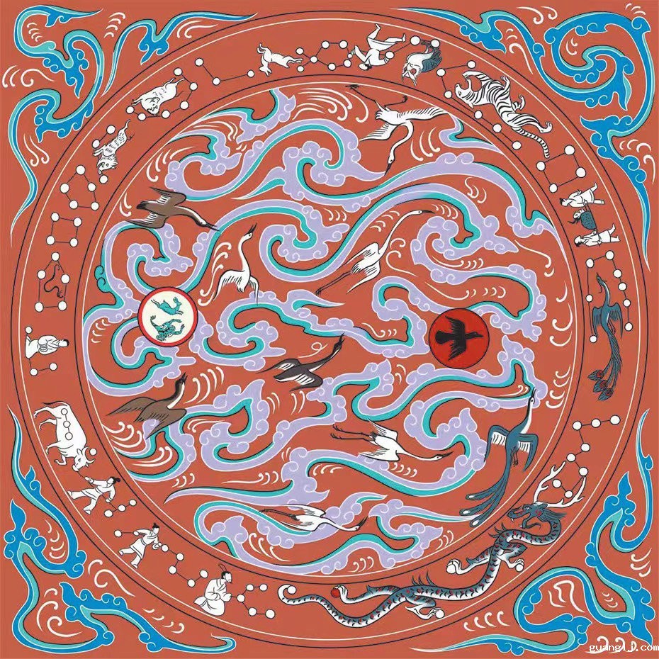 1987 年 4 月,在西安交大附属小学发现一座西汉晚期墓葬。墓主室顶部中心绘日月云 气纹,仙鹤、鸿鹄等祥禽穿插其中。外侧两个同心圆内绘二十八宿及相应星象图案,苍龙代表角、亢、 氐、房、心、尾六宿,斗宿为人持斗,牛宿为人牵牛,虚、危两宿中间绘一小蛇象征玄武,白虎对应 参宿,柳、星、张、翼四宿与朱雀相配。全图绘有恒星80余颗,是目前所见年代最早的二十八宿图像, 对我国古代天文史研究具有重要价值。本图为这幅西汉时代二十八宿天象图的摹本。